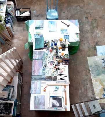In het voorjaar werkte ik een maand lang in een residentie van de Foundation Knecht-Drenth in Spanje. In dit slaperige Spaanse stadje Callosa d’en Sarrià is NIETS te doen, zodat je je helemaal kunt richten op je werk. Ik had er en heerlijke tijd en heb me laten inspireren door de kleuren van het land en de structuren op muren en gebouwen. In het atelier heb ik vooral veel geëxperimenteerd met schildertechnieken en ondergronden.